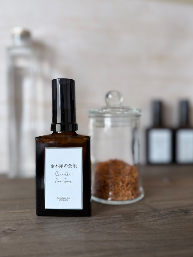 商品名:金木犀の余韻〜aroma room spray〜 芳しい金木犀の香りを日常に! そのままの自然の香りを楽しめる、金木犀の余韻〜aroma room spray〜をご紹介します。自宅で手軽に、心豊かになる空間を演出できるスプレーです。金木犀の花を丁寧にチンキにして、その香りを生かしました。さらに蒸留した金木犀の芳香水と、金木犀精油、そして爽やかなオレンジ精油をプラスすることで、深みと清涼感が絶妙に融合しました。 このスプレーは、リフレッシュしたい時や心を穏やかにしたい時にぴったりです。金木犀の優雅な香りが広がることで、日々のストレスを和らげてくれます。リラックスしたいひとときに、ぜひご活用ください。 【使用している原料】 金木犀花芳香蒸留水、金木犀花チンキ(無水エタノール)、オレンジ油、金木犀油 【サイズ】 30mlのスプレーボトル(ガラス) こんなときにおススメ ・お部屋の空気をリフレッシュしたい時 ・大切な人を招いた時に香りで癒したい時 ・仕事の合間にリラックスを求める時 ・自分へのご褒美として、心地よい空間を楽しみたい時 心を豊かにする金木犀の香りで、毎日の生活を彩ってみませんか?日々の癒しとして、ぜひ一度お試しください。あなたの空間に、金木犀の余韻を。