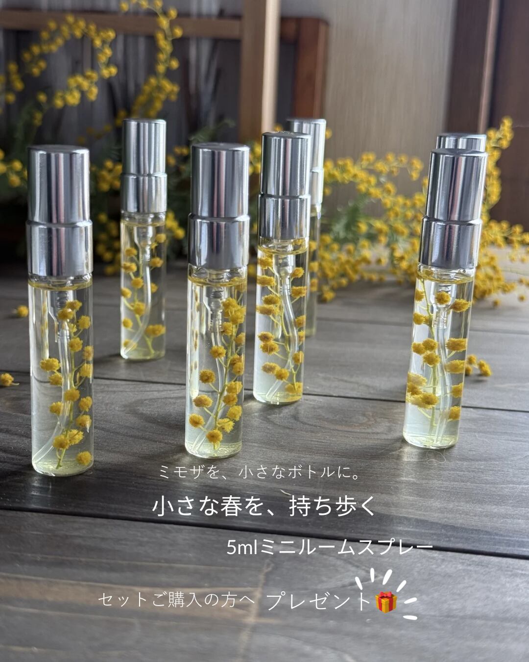 今回お求めの方へ、「感謝」の花言葉ミモザの花を閉じ込めたルームフレグランス5mlをプレゼント。こちらも、どうぞお楽しみください。